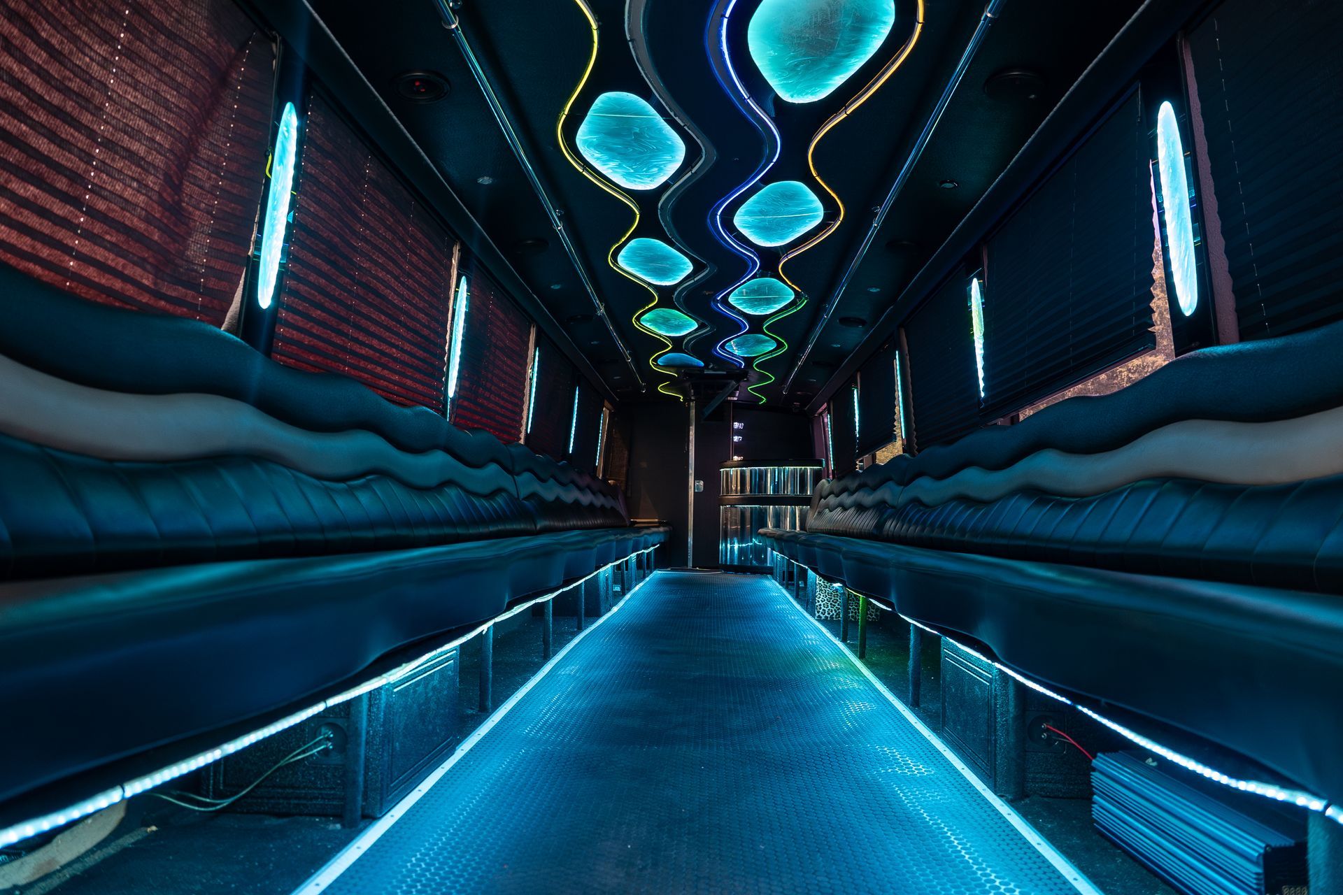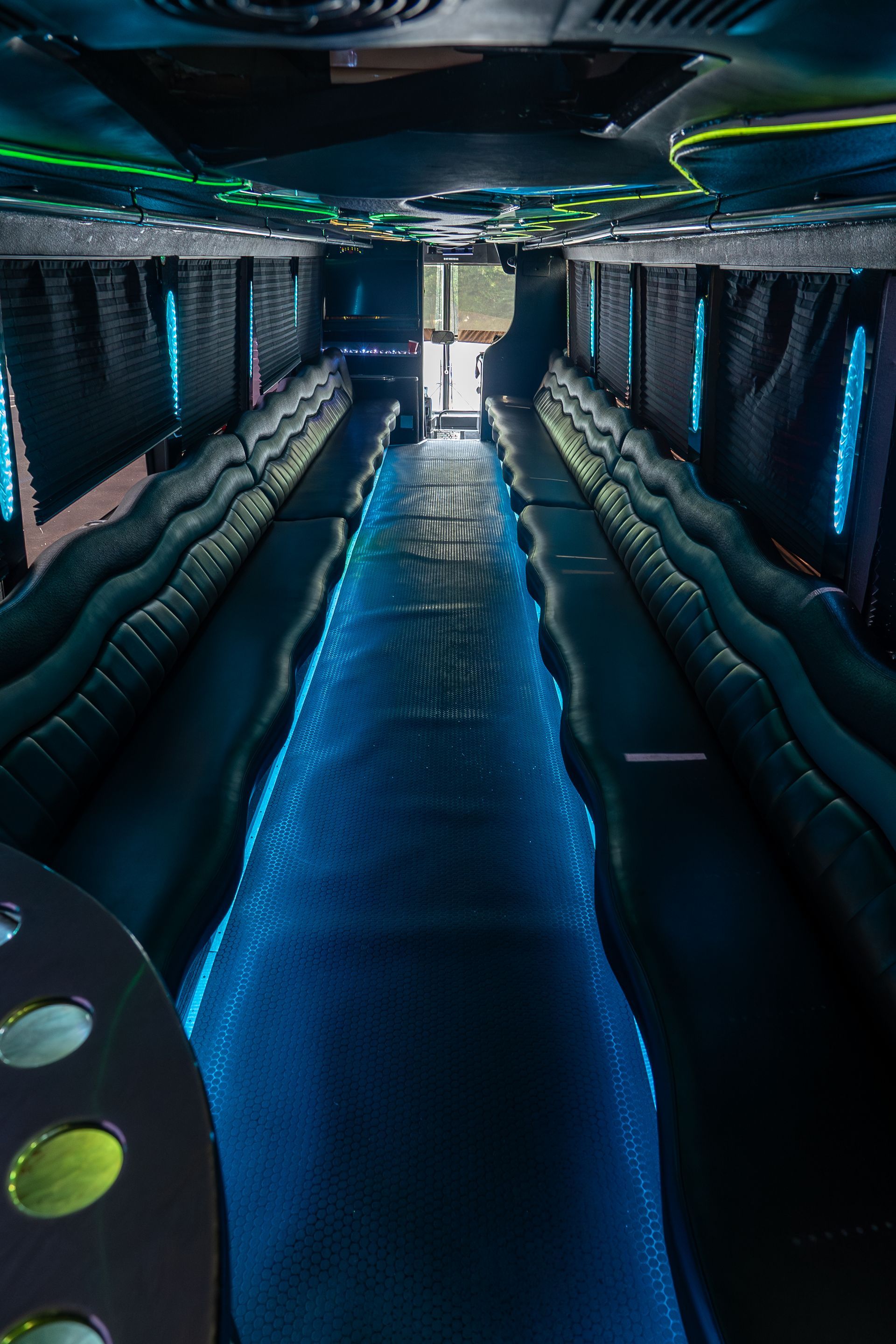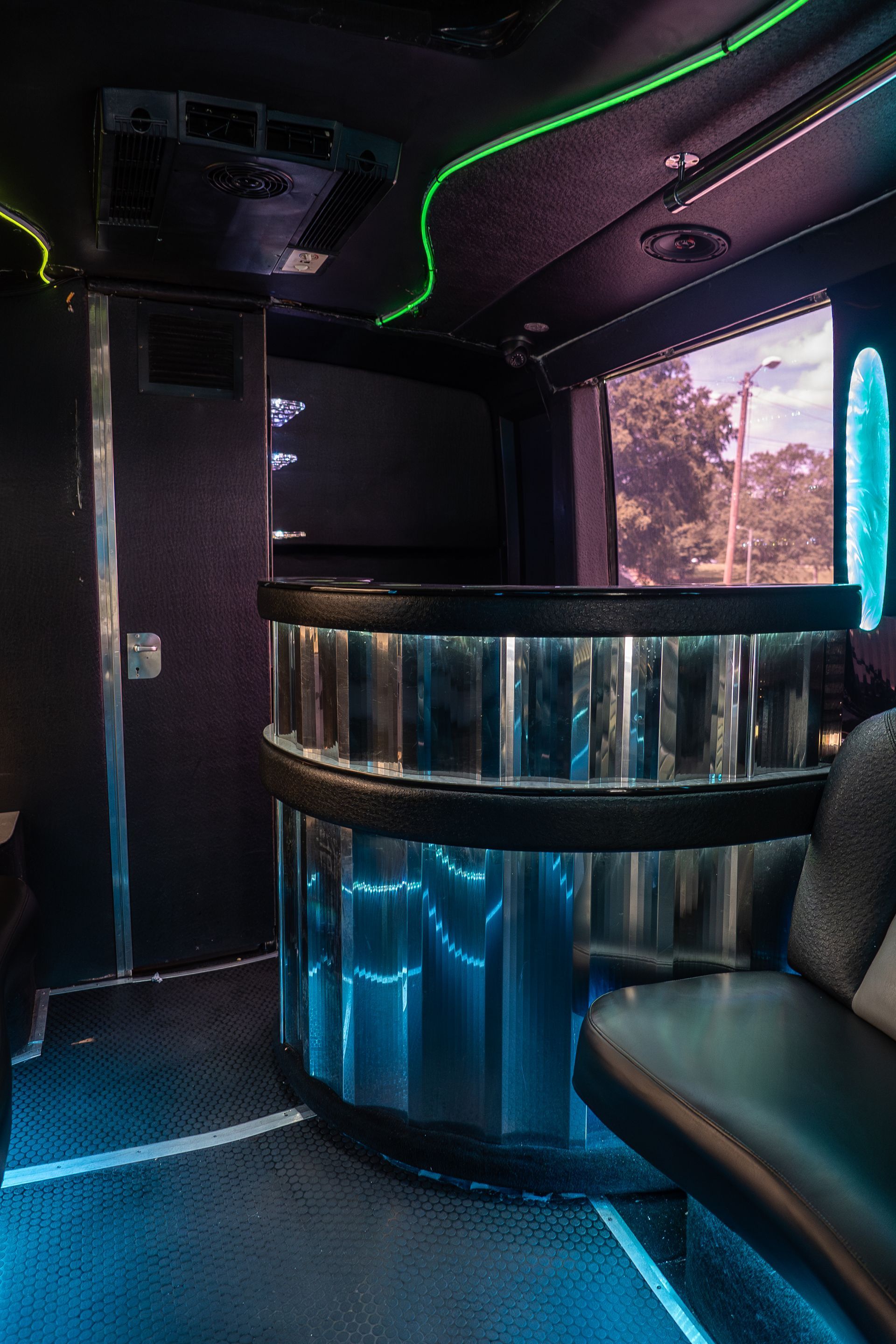 - Three neon-lit beverage spaces throughout the bus, including a full bar with glass and bottle holders